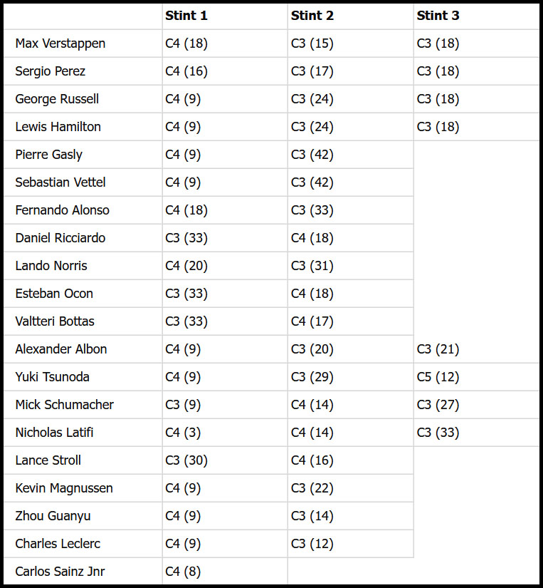 드라이버들의 타이어 교체 전략(C3 하드, C4 미디엄, C5 소프트)