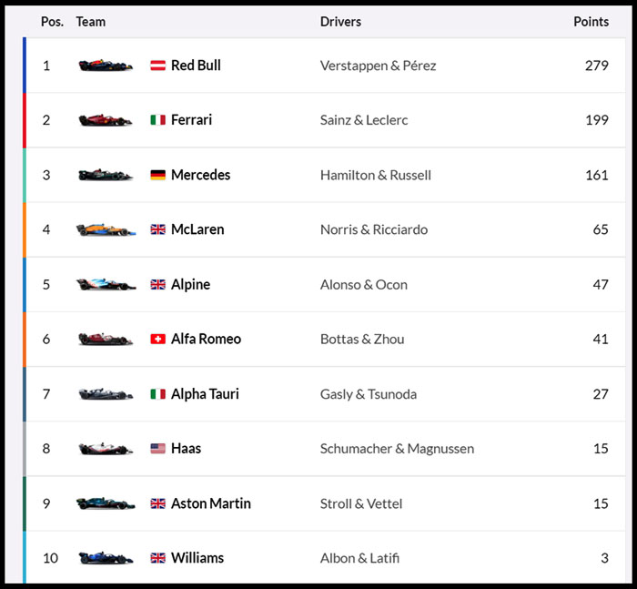 이번 시즌 총 8번의 그랑프리에서 모두 5위 안에 들어간 러셀이 3위에 올랐고 그뒤로 해밀턴이 4위를 차지하며 레드불과 페라리에는 미치지 못한 페이스지만 중위권에서는 꾸준하게 앞선 모습을 보이고 있는 메르세데스 입니다. 이번 그랑프리에서는 스페인에서 개선된것으로 보이던 폴포징이 현상이 유독 심하게 나타났으며 해밀턴은 레이스 도중 심한 고통을 호소하기까지 했습니다.