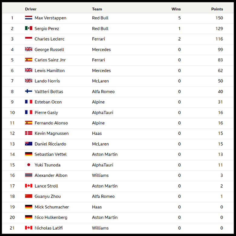 현재순위 페레즈 베르스타펜 르끌레르 러셀 알론소 노리스 리카르도 가슬리 오콘 베텔 해밀턴