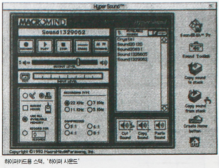 또, 직접 내장 마이크로 사운드의 추가나 삭제 등을 할 수 있다. 한편, 시스템 차원이 아니라 애플 리케이션에서 이를 활용할 수 있는 방법으로는 하이퍼카드에서 사용하는 것이다. 하이퍼카드도 매킨토시를 구 입할 때 기본적으로 제공되는 것으로 간단한 데이터베이스 등의 애플리케이션을 초보자라도 쉽게 만들 수 있다는 장점을 가지고 있다.
