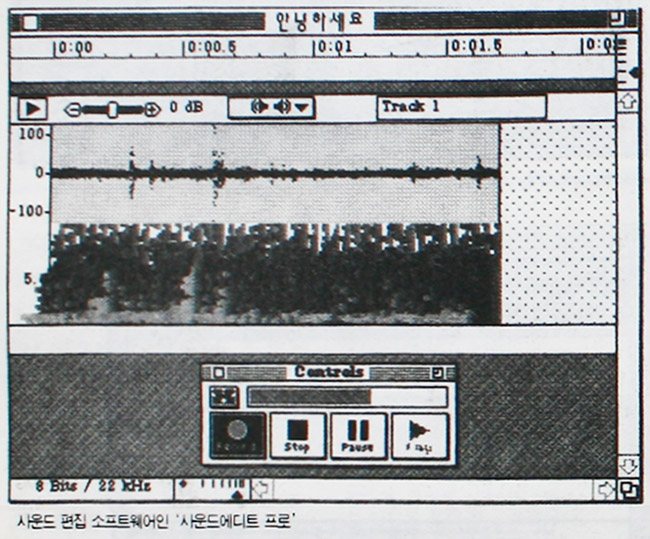 ④ 레코딩 샘플링 비율도 사운드의 음질을 결정하는 중요한 요인으로 높을수록 나은 질을 보이나 매킨토시는 초당 22.1KHz로 한정되어 있다. 만약 11KHz로 레코딩한다면 용량면에서 1/2로 줄어드나 감상하기에는 다소 무리가 있는 편이다. 이러한 경우에는 SoundMover라는 유틸리티를 사용하여 22KHz로 녹음한 다음, 11KHz로 변경하는 것이 가장 효과적이다.
