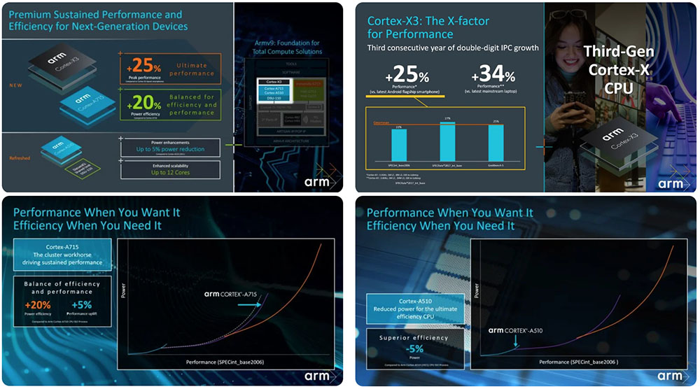 ARM은 Cortex-X3가 25% 더 높은 피크 성능을 제공하고 Cortex-A715는 20% 더 나은 전력 효율성을 제공한다고 밝혔으며Cortex-X3 CPU 코어는 지난해 Dimensity 9000/9000+ , Exynos 2200 , Snapdragon 8 Gen 1 시리즈에 사용된 Cortex-X2 CPU를 계승한다고 밝혔습니다.