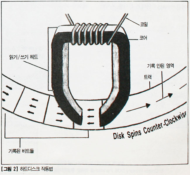 하드디스크는 플래터(platter)와 읽기/쓰기 헤드로 그 중심축을 이루고 있다. 읽기/쓰기 헤드는 코일(coil)이라고 부르는 전기선을 감싸서 만든 전자석이다. 코일은 코어(Core)라고 부르는 철을 기본으로 하는 말굽 모양의 금속을 감고 있는 상태이다(그림 2 참조).