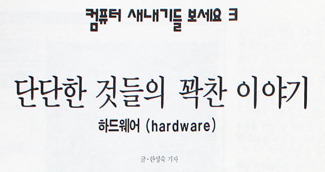 앞으로 컴퓨터 용어를 우리말로 바꾸는 일이 완결, 정식안이 발표되고 나면 그 다음에는 당연히 그를 따라야 하겠지만 이번 기사에는 우리는 그냥 하드웨어라고 부르기로 한다. 얘기가 너무 곁가지로 흘렀다. 세번째 시간은 바로 '하드웨어 정복하기' 의 첫 시간이라 이런 장광설을 늘어 놓게 되었다.