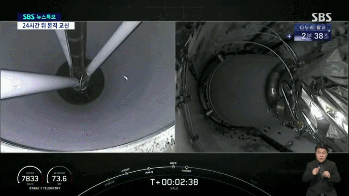 발사체와 분리시의 속도는 초속 약 10.15km였으며 분리고도는 약 703km였습니다. 한국 항공우주연구원 연구진은 발사 92분후인 오전 9시 40분경 호주 캔버라에 위치하고 있는 나사의 심우주안테나를 통해 다누리와 교신하여 위성 상태에 관한 데이터를 수신하였다고 설명했습니다.