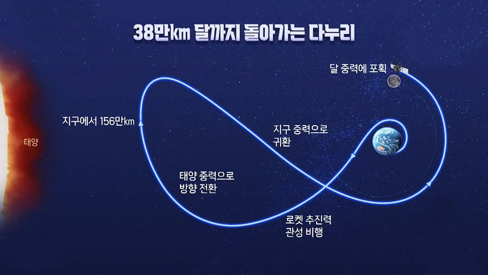 달까지는 약 4개월 가량 소요되며 나비 모양으로 멀리 돌아 달까지 항해을 하게 되는데 이는 지구 자전 속도를 이용해 발사체의 연료 소비를 최소화 하기 위함입니다.
