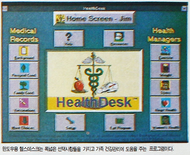 미국 헬스데스크가 건강 관리용으로 개발한 프로그램, '윈도우용 헬스데스크'는 3가지 기본 항목을 가지고 있다. 건강과 관련한 정보, 자신의 의학적 기록, 건강 활동 등에 관한 정보를 기록하고 관리할 수 있다. 건강 정보에는 각종 건강 상식과 몸에 관한 정보 등이 담겨있다. 소형 의학 사전이라 부를 정도로 운동 기술, 초기 이상 증세에 대한 메시지 등이 자세히 기술되어 있다.