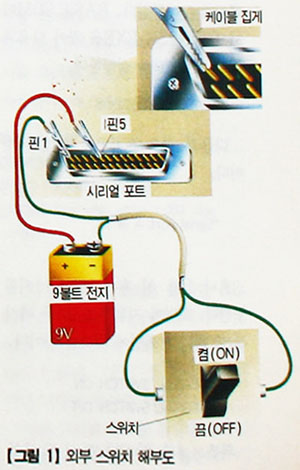 PC에는 9핀이나 25핀으로 된 시리얼 포트가 2개가 있을 것이다. 비어있는 쪽을 사용한다. 작은 집게를 전선 양 끝에 연결해 시리얼 포트의 1번과 5번핀을 짚는다. 컴퓨터의 다른 금속 연결 부분에 집게가 닿지 않게 한다. 집게의 다른쪽 끝은 <그림 1>처럼 전지와 스위치에 연결한다. 100피트 이상의 전선을 사용할 수 있지만, 50 피트 이상이 되면 전기 노이즈가 생겨 오히려 잘못될 수도 있다.