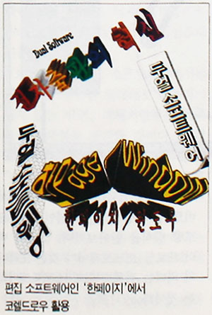 물론 이외에도 완벽하게 자유스런 그림 그리기를 위해 코렐드로우는 많은 기능이 있으나 여러분의 몫으로 남겨 놓기로 한다. 그러나 한가지 코렐드로우의 장점 중 빼 놓을수 없는 것이 문자 처리이다.