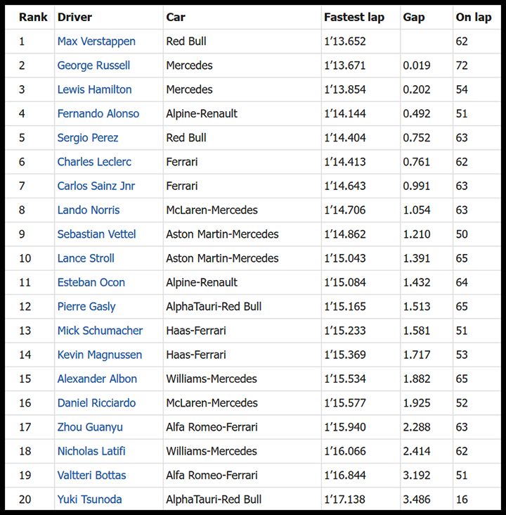 LAP 52 베르스타펜 패스티스트 랩. 러셀 패스티스트 랩. 츠노다의 피트레인에서의 사건은 레이스 후 조사. 알론소 패스티스트 랩.