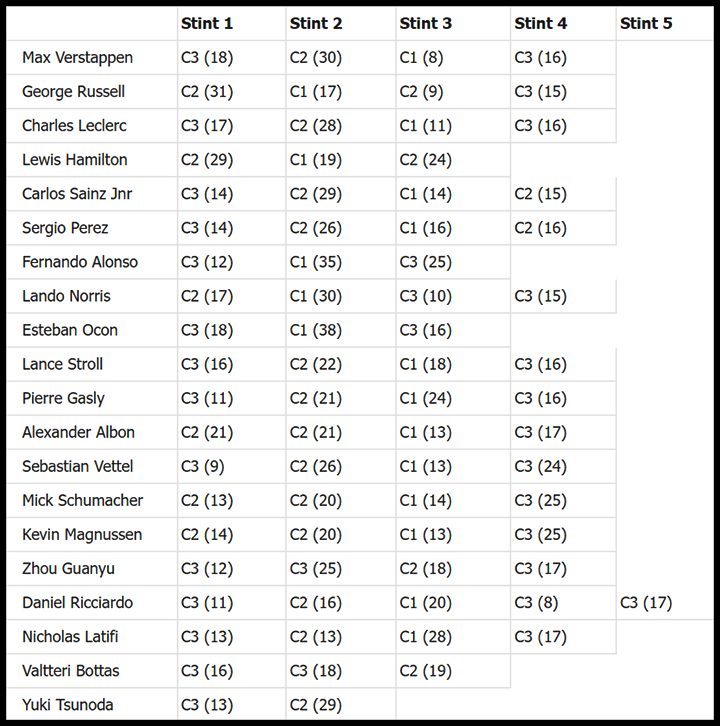 드라이버들의 타이어 교체 전략(C1 하드, C2 미디엄, C3 소프트)