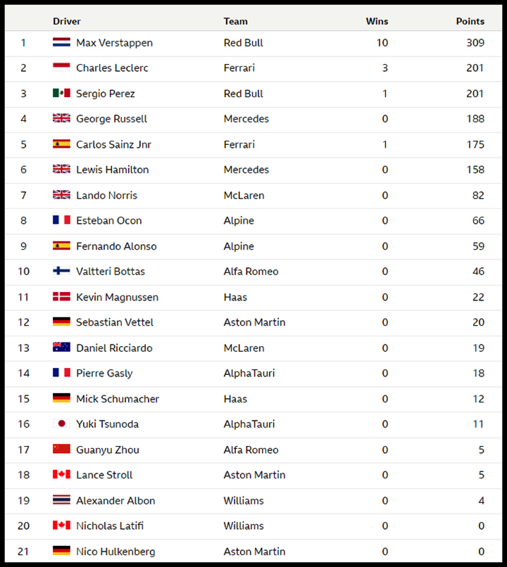 현재순위 베르스타펜 러셀 르끌레르 페레즈 해밀턴 사인츠 노리스 스트롤 알론소 오콘 츠노다 가슬리