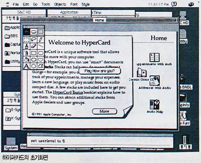 이러한 이유로 하이퍼카드는 사용자들의 절대적인 지지와 그 범용성 등으로 IBM-PC 환경에까지 큰 영향을 끼쳐, 현재 멀티미디어용 개발툴로 인기를 끌고 있는 툴북(ToolBook)이라는 하이퍼카드와 유사한 소프트웨어를 탄생시키는데 기여했다. 그러면 이번 호에서는 하이퍼카드란 과연 무엇이며, 또 그것을 어떻게 활용 하고 있는지를 살펴보도록 하겠다.