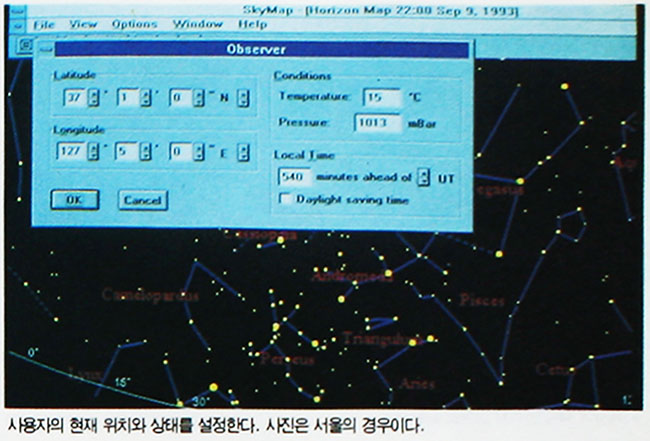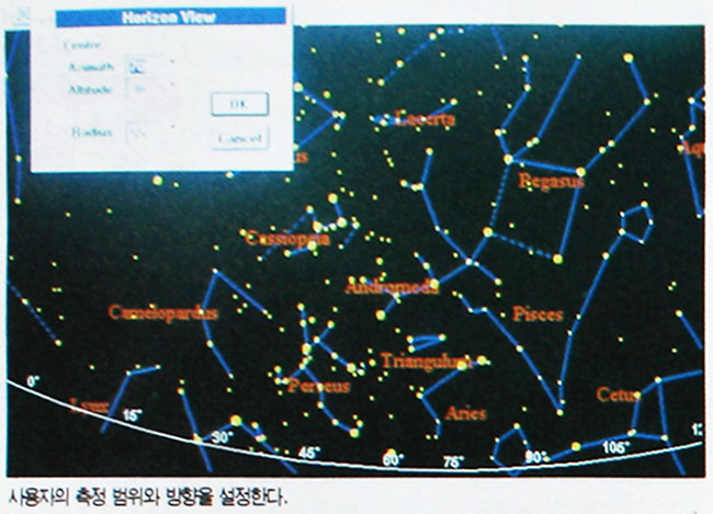 Horizone Map'을 선택하면 또 하나의 검은색 창이 열린다. 별자리를 나타낼 기본 준비는 끝났다. 이제 부터 자신의 관측지점을 프로그램에 등록하면 밤하늘의 별들이 화면 가득 편쳐진다. 관측 지점 등록은 'Option' 기능의 'Observer'를 선택하고 관측자의 위도와 경도를 기입한 뒤, 기압과 온도, GMT기준 시간대를 기입한다.