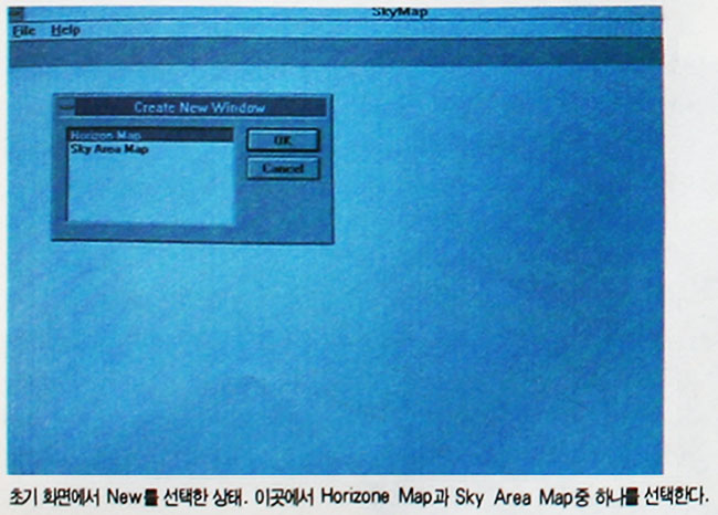 우선 하늘지도의 디렉토리를 설치한 후에 압축되어 있는 프로그램 세 개를 차례로 푼다. 윈도우에서 아이콘을 넣고 싶은 그룹을 선택해 프로그램 관리자의 'NEW' 기능을 이용, 프로그램을 등록한다. 그러면 귀여운 망원경 모양의 아이콘이 나타난다. 하늘지도를 실행하면 아무 정보도 없는 깨끗한 상태의 윈도우가 뜬다.