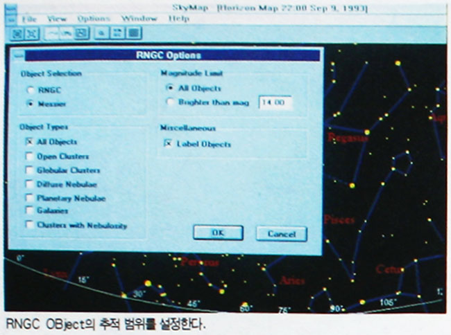 Label Object는 각각의 성운, 성단의 이름을 화면상에 출력하는가를 결정하는 옵션이다. 이 RNGC 선택사항은 하늘지도에서 가장 핵심적인 역할을 하며 가장 복잡한 부분이다. 이 기능을 제대로 활용하려면 천문학적인 지식과 관심을 필요로 한다.