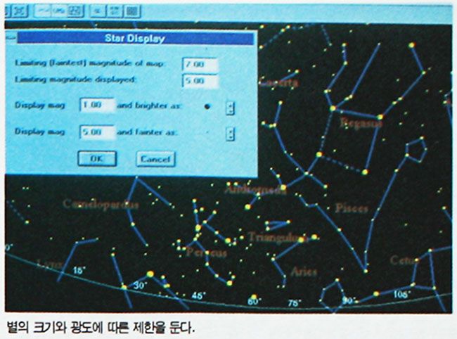 여기서 날짜와 시간이 현재와 일치하는가를 확인하고 다를 때는 메인 그룹의 콘트롤 패널에서 시간과 날짜를 정확히 바꿔준다. 화면상에 나타난 별들은 크기가 각각 다르다. 별 크기는 별 등급에 따른 것이다. 초기 상태는 5등급 이하의 별들만 표시하고 이 프로그램은 7등급까지 별을 보여준다.