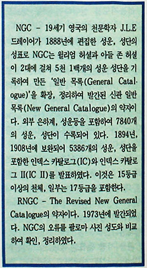 RNGC Object를 확인하면 정보 박스의 상위에는 RNGC Number와 Popular Name, Type of object, Magnitude, Descriptionol 나타난다. 이러한 정보가 항상 나오는 것은 아니고 경우에 따라서는 생략될 수도 있다. 이런 각각의 정보에 대해서 좀더 자세히 알아보기로 하겠다.