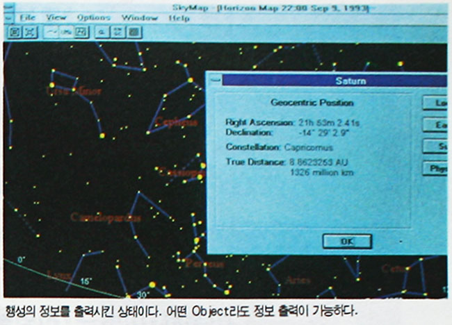 도스의 딱딱한 느낌에서 벗어나 좀 간편한 조작으로 방대한 양의 정보를 얻을 수 있다는 점과 초보자와 전문가 모두 활용할 수 있는 프로그램이라는 부분이 더욱 매력적이었다. 스카이글로브가 못마땅했다던가 아니면 좀더 친근한 창을 열어 저 무한한 밤하늘의 공간으로 여행을 떠나려는 독자 여러분들에게 그 길을 제시하고자 한다.
