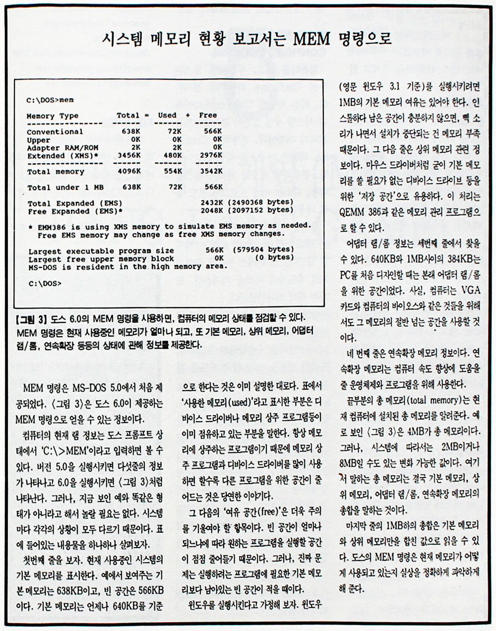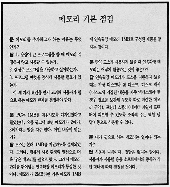 기본 메모리 사용에 관심을 기울여야 하는 이유는 이 공간이 도스와 도스 프로그램을 실행하는 공간인 탓이다. 게다가 이 공간은 어떤 기종이든지 640KB(XT의 경우 512KB인 시스템도 있지만)로 한정되어 더욱 신경을 써야 한다. 메모리 부족으로 허덕이는 요즘 사용자들의 곤란은 빈약한 기본 메모리 한계를 고려한다면 일어날 수 밖에 없는 당연한 일이다.