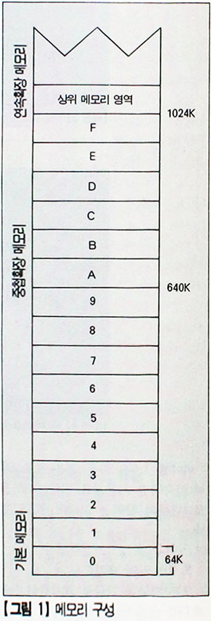 그렇다면, 왜 640KB인가? PC 메모리의 처음 디자인은 8088 마이크로프로세서는 1MB 램까지 액세스 하도록 되어 있었다. 이 메모리는 64K단위로 조각조각 나 있다. 기본적인 메모리 구성은 <그림 1>과 같다. 각각 64KB짜리 16개열로 구성되어 있다.