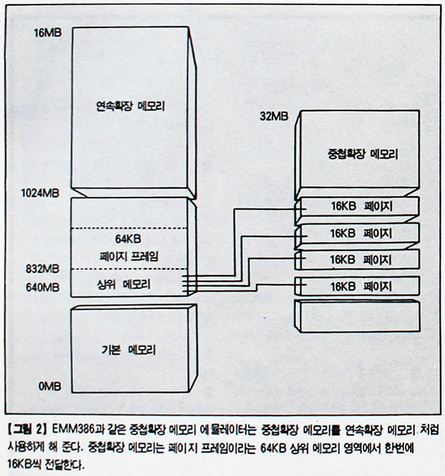 중첩확장 메모리는 PC 메모리의 기본 구성은 아니다. 페이지 프레임 이라고 불리우는 특별한 영역을 통해 접근할 수 있다. 이는 16K 페이지 4개를 포함하는 상위 메모리의 64KB이다. 각 페이지는 중첩확장 메모리에 복사하거나 읽어들일 수 있는 메모리를 포함하고 있다 <그림 2>.