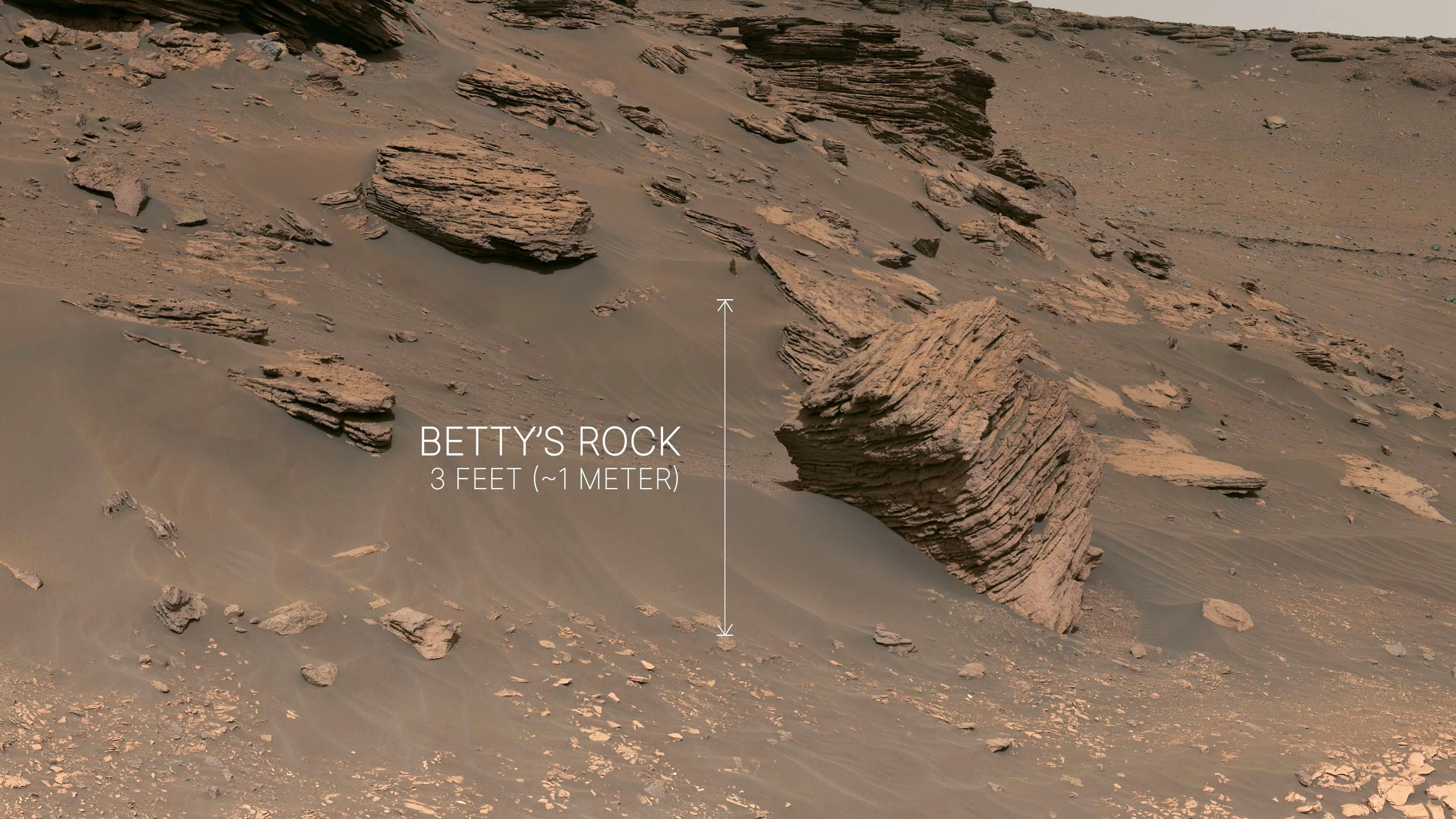 더 흥미로운 것 중 하나는 Betty's Rock이라고 하는 약 1미터 높이의 바위로 자세히 살펴보면 이 암석들은 수십억 년 동안 화성 표면에 앉아 있었고, 그 시간 동안 바람에 의한 침식작용을 받은 것을 볼 수 있습니다.