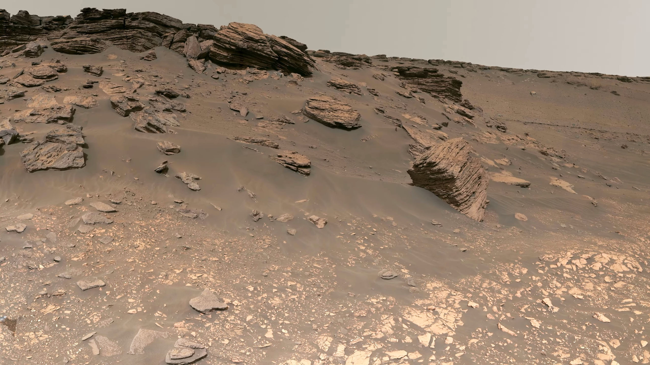 아래 사진에는 로버 앞에 약 11미터 정도 높이의 절벽을 구성하는 짙은 회색의 층을 이룬 암석을 볼수 있는데 이 암석에서 매우 명확한 수평 층을 볼 수 있으며 절벽의 조각들이 부서져 내리막으로 굴러떨어진 것을 확인할 수 있습니다.