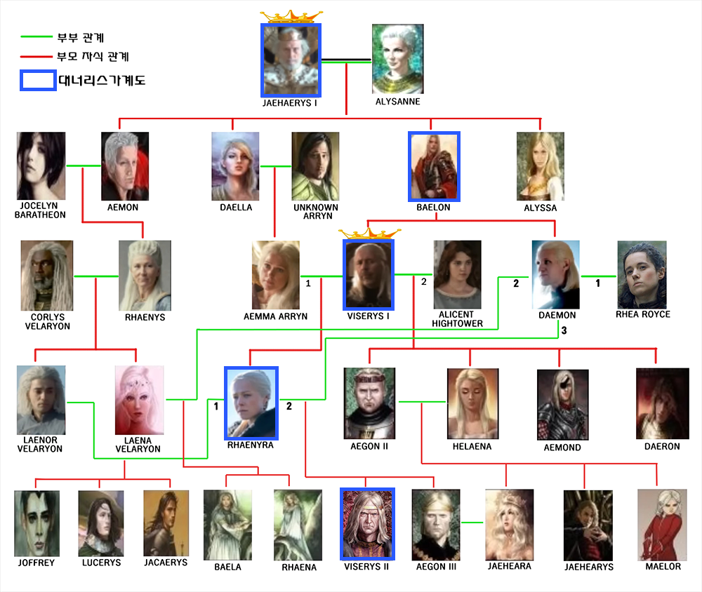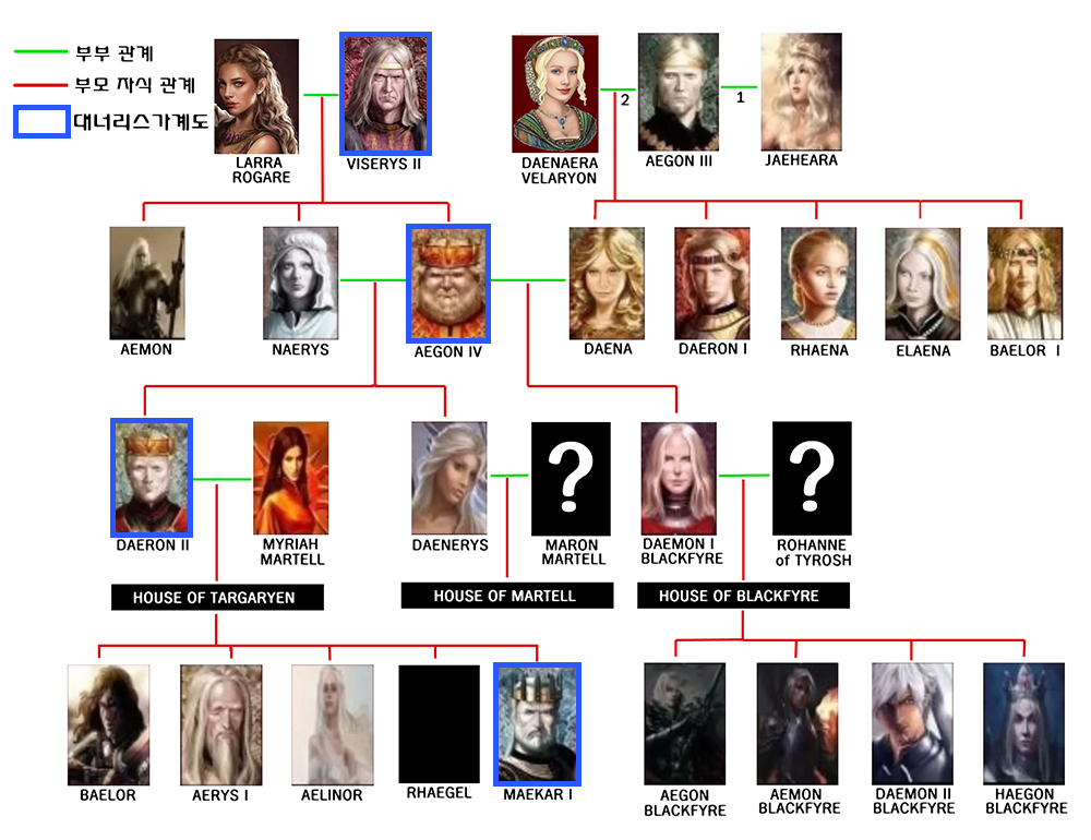Jaehearys I → Baelon → Veserys I → Rhaenyra(& Daemon) → Viserys II 라인이 대너리스로 이어지는 가계도입니다.