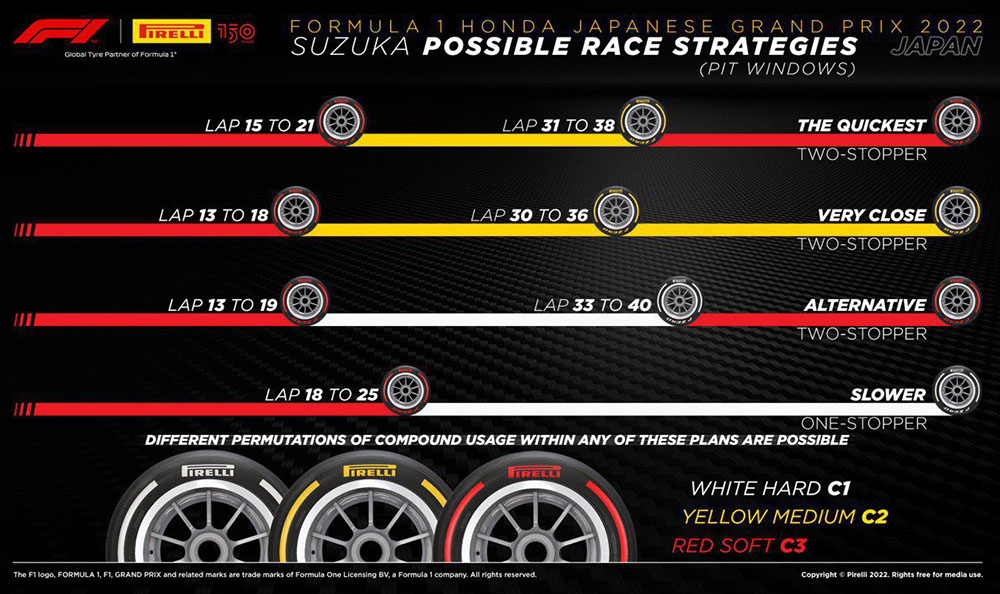 타이어 소모가 심한 스즈카 서킷 답게 피렐리에서는 2스탑 전략을 내세웠지만 경기 시작전부터 비가 내리는 상황이 벌어지면서 타이어에 관련된 전략은 쓸모없게 되었습니다. 그리고 레이스 후반에 내가 더 많이 내릴 가능성이 있기에 인터미디어트로 시작된 레이스가 후반에 풀웨트로 바뀌는 상황이 연출 될 가능성이 높습니다.