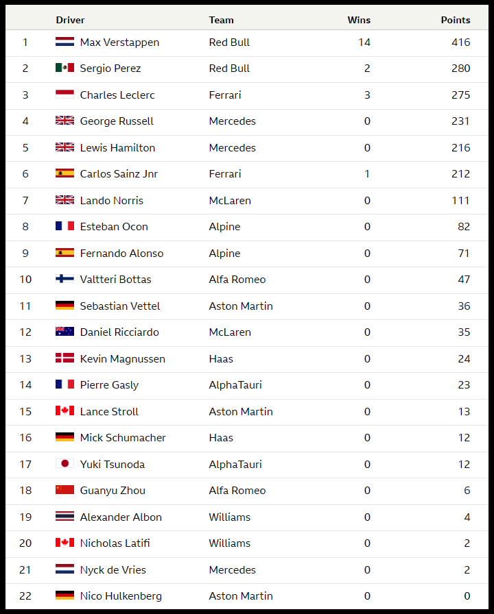 현재순위 베르스타펜 해밀턴 페레즈 러셀 사인츠 알론소 르끌레르 리카르도 저우관유 보타스 오콘 가슬리