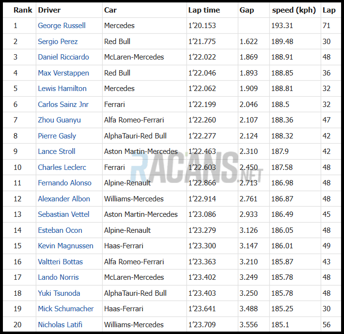 LAP 50 현재순위 베르스타펜 해밀턴 페레즈 러셀 사인츠 르끌레르 알론소 오콘 보타스 노리스 츠노다 리카르도