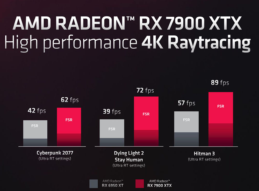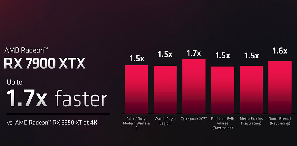 AMD는 새로운 RX 7900 XTX가 4K 해상도에서 이전 최상위 모델인 RX 6950XT보다 최대 1.7배 더 빠를 것이라고 발표했으며 AMD에 따르면 RDNA3 아키텍처는 RDNA2보다 54% 더 나은 와트당 성능을 제공해야 말했으며 가장 빠른 RDNA2 GPU와 비교하여 일부 인기 있는 타이틀에서 더 높은 성능을 낸다고 주장하고 있지만 아쉽게도 엔비디아의 RTX 40과 비교데이터는 없었습니다.