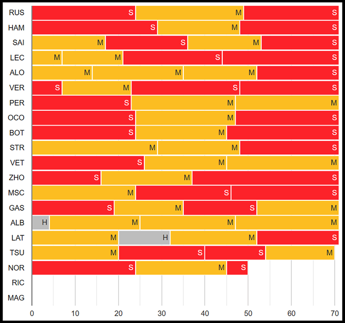 드라이버들의 타이어 교체 전략 ( C2 하드◎, C3 미디엄◎, C4 소프트◎ )
