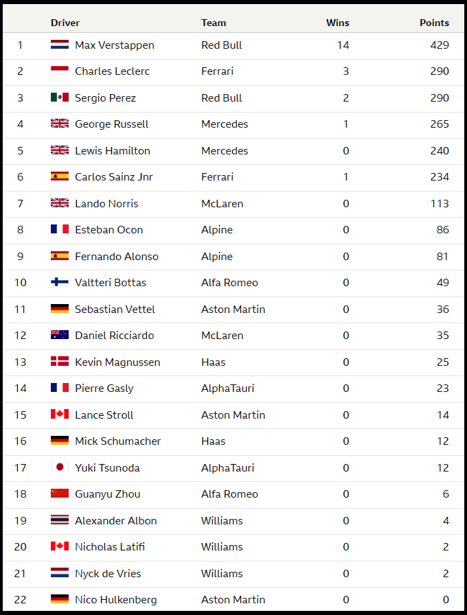 드라이버별 2022 시즌 성적표 (순서는 2021시즌 팀 순위)