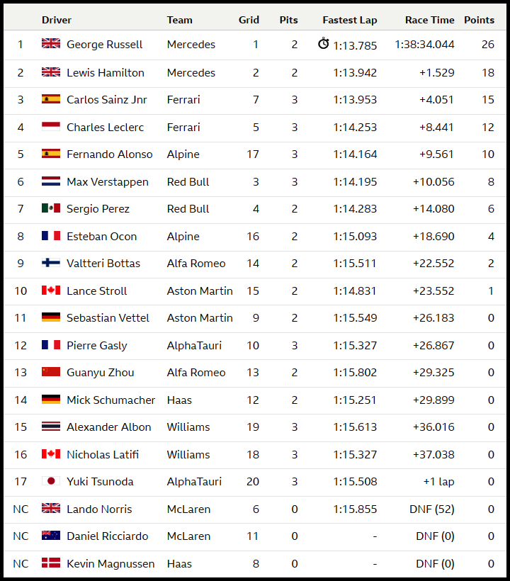 러셀은 스타트 이후 줄곧 선두를 달리면서 조금은 여유롭게 우승을 차지하나 싶었지만 52랩 노리스가 차량을 트랙밖에 세우고 리타이어하는 장면에서 차량을 마샬들의 손으로 꺼내지 못하자 결국 세이프티카가 나오면서 상황이 조금 급박하게 돌아갔습니다. 그러나 세이프티카가 들어가고 재개된 경기에서 러셀은 해밀턴의 추격을 크게 받지 않고 레이스를 잘 마무리 하면서 생애 첫 우승을 거머쥐었습니다.