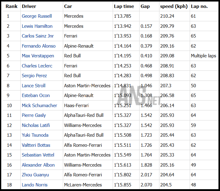 현재순위 러셀 사인츠 러셀 페레즈 알론소 보타스 베텔 르끌레르 오콘 가슬리 베르스타펜 노리스