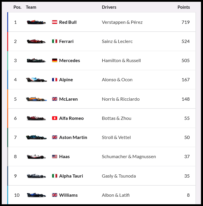 지난 멕시코 그랑프리에서 알핀에게 7점차까지 쫓아왔던 멕라렌은 이번 브라질 그랑프리에서 노리스와 리카르도가 모두 리타이어 한 반면에 알핀은 알론소가 5위로 10포인트, 오콘이 8위로 4포인트를 획득했습니다. 이로 인해 두팀간 의 격차는 19포인트로 벌어졌습니다.
