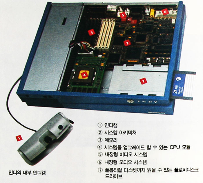 인디가 기존의 멀티미디어 PC와 다른 점이 있다면 바로 이런 부과 장치 없이 시스템 내부에 멀티미디어 장치를 완벽하게 해 놓았다는 것이다. 인디 시스템은 밉스의 R4000 프로세서를 내장하고 모듈 타입으로 CPU를 장착하도록 되어 있어 시스 템을 업그레이드시키기가 편리하다.