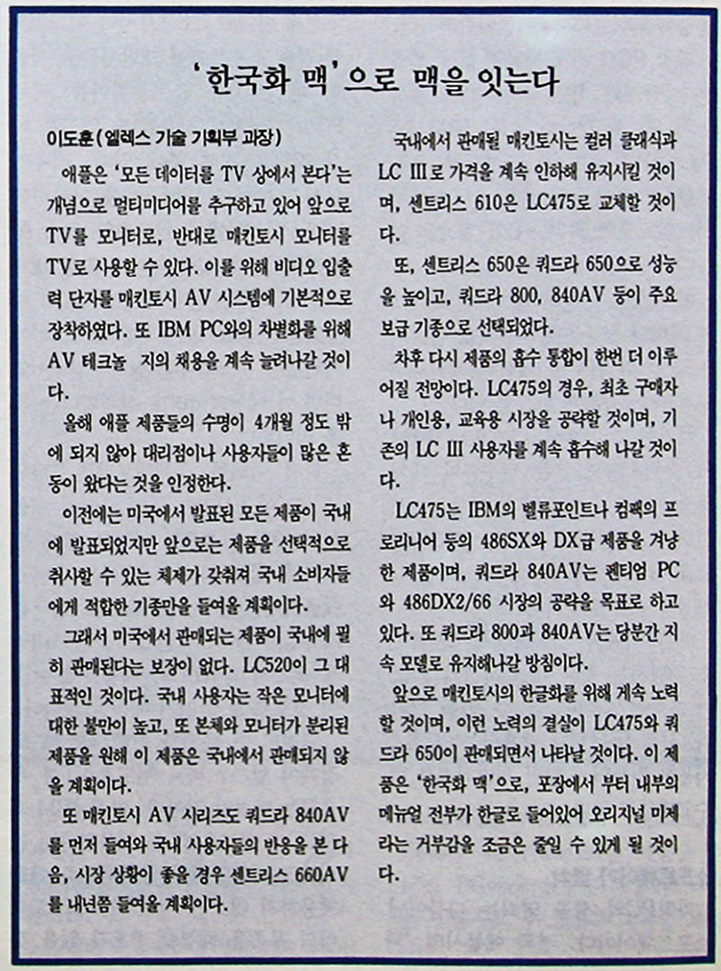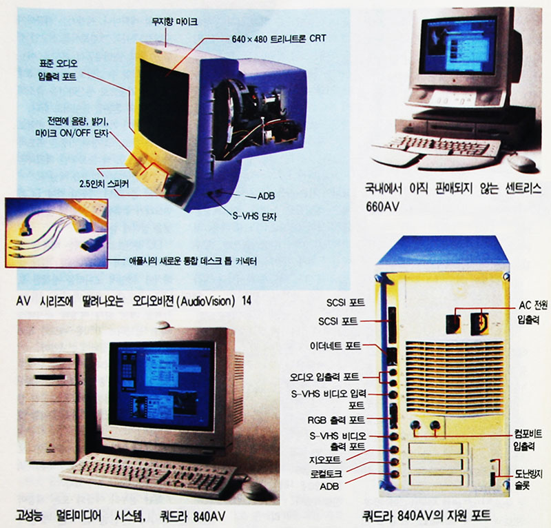 여기에 최근 발표된 AV(오디오 비주얼) 시리즈로 쿼드라 840AV, 센트리스 660AV가 있다. 몇년 전부터 애플의 모든 제품이 발표될 때마다 관심을 끌게된 배경에는 성능의 좋고나쁨 보다 '꿈의 컴퓨터 매킨토시를 싸게 구입할 수 있다' 라는데 초점을 둔 것이 사실이다.