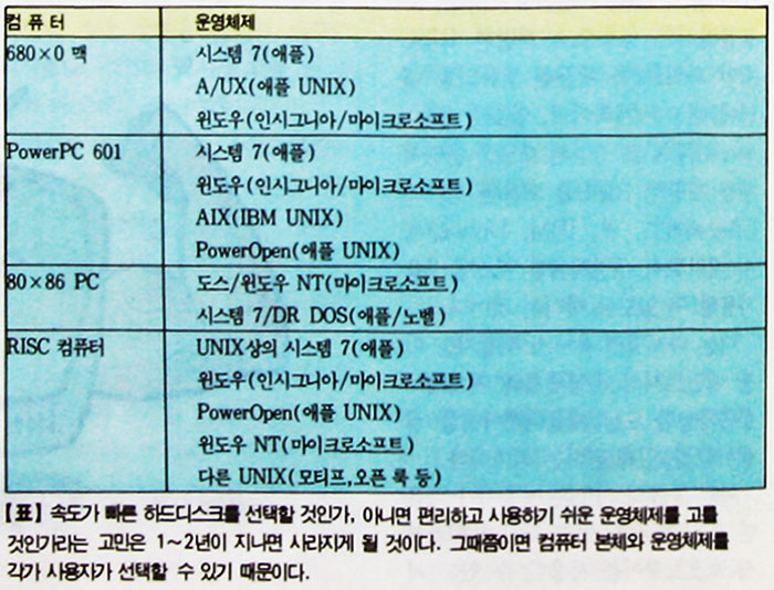 매킨토시의 운영체제는 모토롤라의 680x0 계열, 고속의 유닉스는 RISC 컴퓨터를, 가장 저렴한 환경을 원한다면 윈도우가 실행되는 80x86 계열 등으로 대분된다. 그러나 이러한 고정관념이 서서히 깨지고 있다. 그리 먼 미래가 아니라 내년 초부터 그 가능성이 보인다.