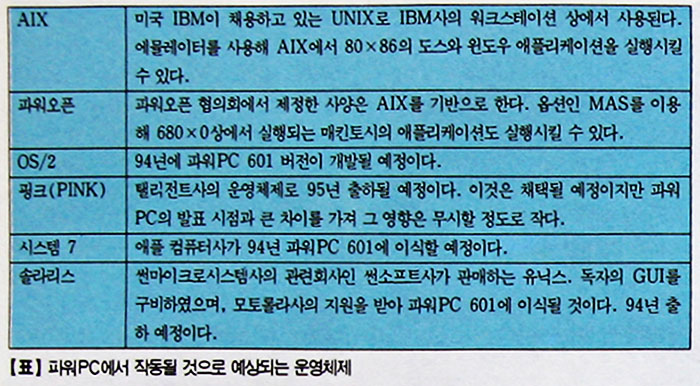 한편 이러한 추세대로라면 '파워 PC 맥'이 94년과 95년 사이에 애플사의 주력 기종으로 자리를 잡게 될 것이다. IBM의 파워PC에는 유닉스 애플리케이션이 제한적으로 실행될 가능성이 많다. 이는 IBM사가 내놓을 최초의 파워PC가 대량으로 보급될 것으로 보지 않기 때문일 것이다.