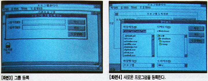 등록 절차는 그룹의 등록과 같다. 단지 프로그램 그룹이 아닌 프로그램 아이템을 사용해야 한다. 그리고 여기에서는 그룹 이름이나 작업 디렉토리 등을 써주지 않고 단지 <찾아 보기>라는 명령으로 원하는 파일만 찾아주면 등록이 된다.