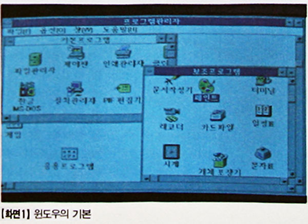 윈도우는 애플리케이션과 파일들을 간편하고 효율적으로 관리하는데 필요한 모든 프로그램을 가지고 있다. <화면1>은 윈도우의 풍부한 그래픽 환경의 기본 구조를 보여주고 있다. 모든 윈도우의 조작은 데스크톱의 기본 내에서 수행되는데 이것은 실제의 책상 표면으로 생각할 수 있다.
