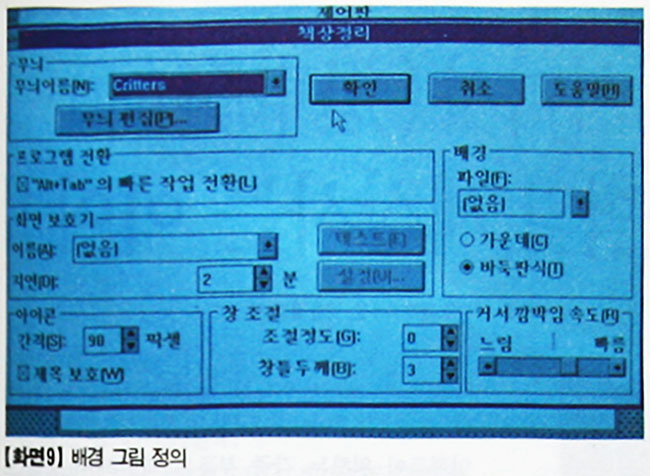 <화면 9>는 배경 그림을 정의해 준 것이다. 지금까지의 윈도우 화면과 다르다는 것을 느낄 수 있을 것이다. 그렇다면 화면 저장은 왜 필요한 것 일까? 요즘 그린 컴퓨터라 하여 하드웨어적인 화면 저장에서는 유해의 감소 등을 들 수 있지만, 화면 저장의 목적은 모니터의 수명 보호라고 보는 것이 좋을 것이다.