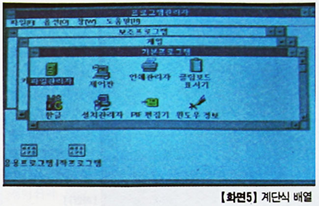 우선 이런 그룹 아이콘이나 아이템 아이콘을 표시하며 작업 환경을 제공해 주는 데스크톱인 파일 관리자가 있다. 다음에 설명하겠지만 파일 관리자 외에도 시멘텍사의 노턴 데스크 톱이 있고, 센추럴 포인트사의 윈도우용 피씨툴이 있다. 이들의 경우 파일 관리자보다 훨씬 진보되고 미려한 외관을 가진 뛰어난 데스크톱들이다. 이번 호에서는 파일 관리자만 알아보겠다.