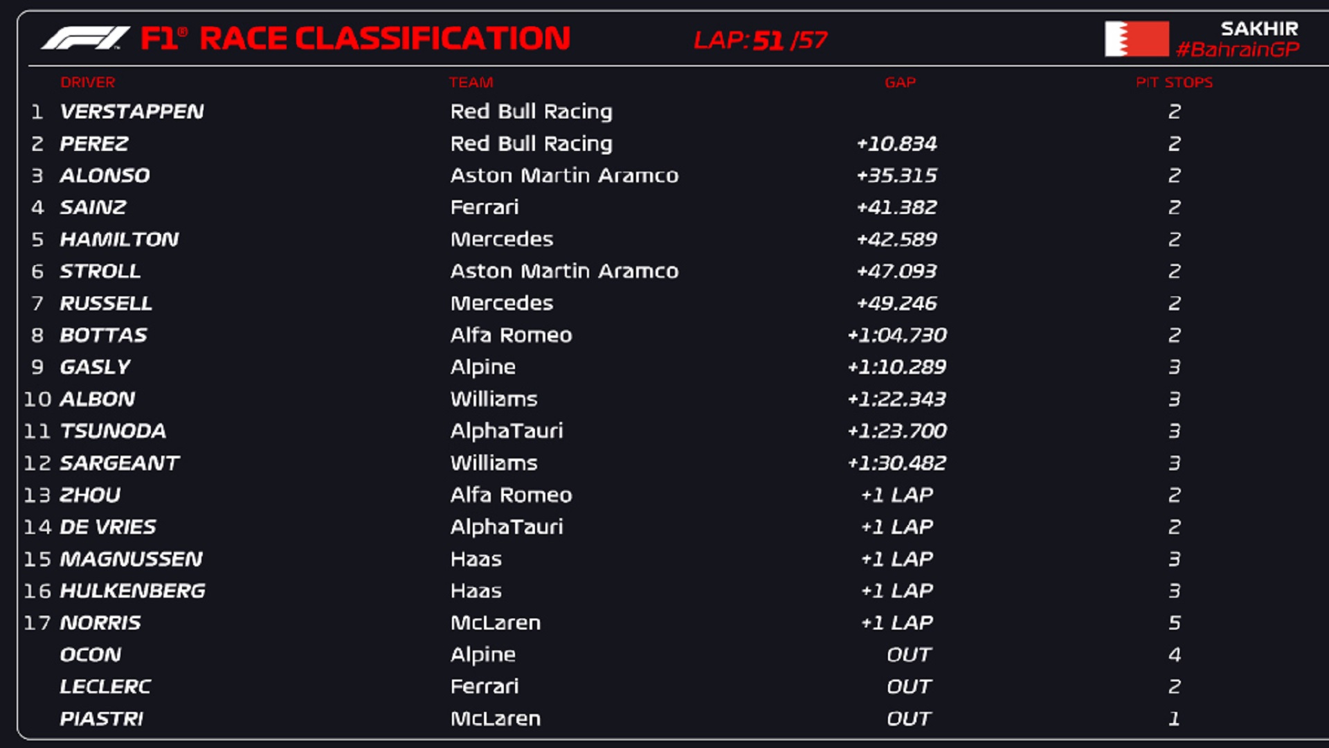 베르스타펜이 아무런 저항도 받지 않고 무난하게 우승을 차지했습니다. 베르스타펜은 그동안 바레인에서 우승이 없었는데 이번에 바레인에서 첫 우승을 가져갔습니다. 또한 팀 동료인 페레즈도 26랩에 2위로 달리던 르끌레르를 추월하며 2위로 올라선후 그대로 체커기를 받으면서 레드불이 원투 피니쉬를 달성했습니다.