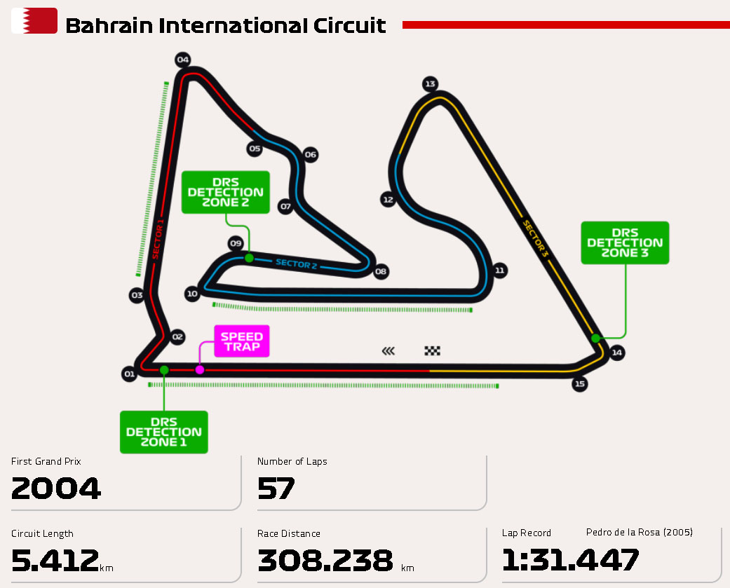 바레인 인터내셔널 서킷은 2002년에 공사에 들어가 2004년에 개장한 서킷이며 15개의 코너로 이루어진 5.412km 길이의 트랙입니다.