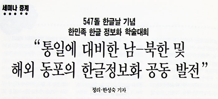 지난 11월 13일, 국립중앙박물관 1층 강당에서 문화체육부 주최, 국어정보학회 주관으로 '통일에 대비한 남북한 해외 동포의 한글 정보화 공동 발전'에 관한 세미나가 열렸다. 547 한글날 기념으로 마련된 이 세미나에서는 국내의 정보화 상황과 중국 연변의 정보화 상황, 북한의 정보 기술 상황 등에 대한 연구 논문이 발표되었고, 북한을 제외한 남한 및 연변의 학자와 관계자들이 참석한 토론회로 진행되었다.