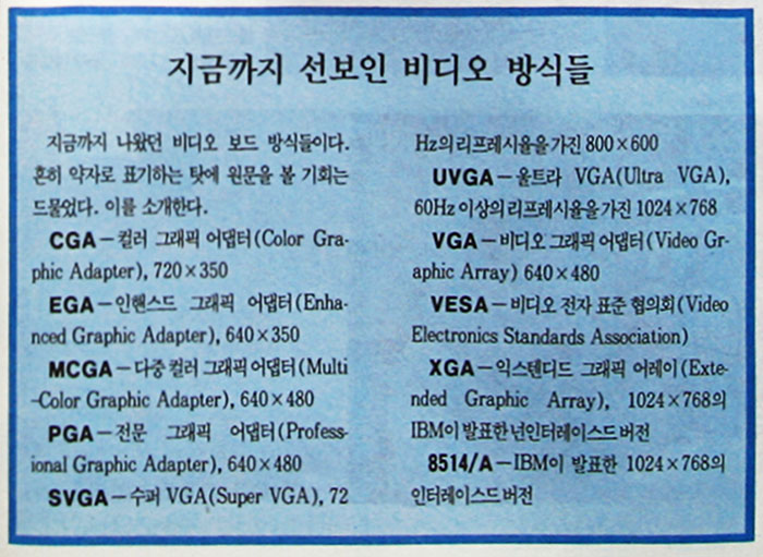 비디오 보드에는 여러 종류가 있지만, 국내에서는 거의 허큘리스를 이어 VGA가 등장했다. 미국처럼 CGA나 EGA와 같은 단계를 거치지 않고, 곧장 VGA 세계로 뛰어든 것이다. 요즘 등장하는 VGA 보드는 거의 대부분 수퍼 VGA까지 지원한다.